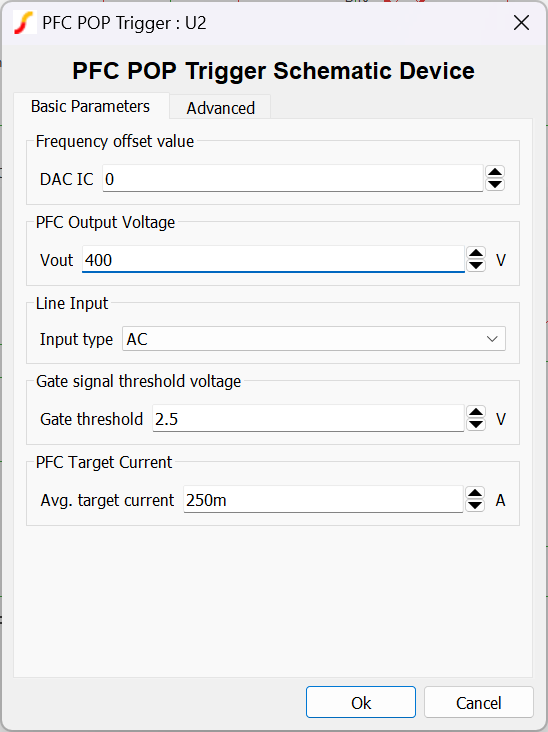 In many PFC rectifier circuits, whether with constant or variable switching frequency, the switching frequency is indeed not an integer multiple of the line frequency, causing POP analysis to fail. The PFC POP Trigger Schematic Device allows the user to synchronize the AC line and PFC rectifier switching frequency, by making (ideally) barely perceptible changes to the switching frequency, so that the switching frequency becomes and exact integer multiple of the line frequency. This then allows a POP and AC analysis to be run successfully.