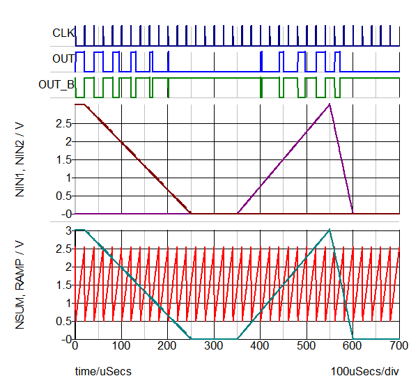 The Trailing Edge PWM block sums all positive inputs ( PIN1, PIN2, ...) and outputs that sum on the PSUM pin. Similarly, all negative inputs are summed and output on the NSUM pin. The output signal, OUT is high when PSUM is greater than NSUM, except during the interval when the clock signal is high in which case OUT is forced low.