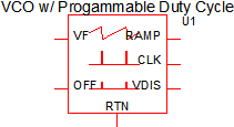 The Voltage Controlled Oscillator (VCO) w/ Programmable Duty Cycle models a VCO with programmable ramp peak and valley voltages and a voltage-to-frequency gain. This block is speed-optimized for SIMPLIS simulations and can be used as a fixed frequency oscillator by connecting a constant DC voltage source to the frequency pin. This oscillator includes an ON/OFF control pin and outputs commonly used signals that include the following: