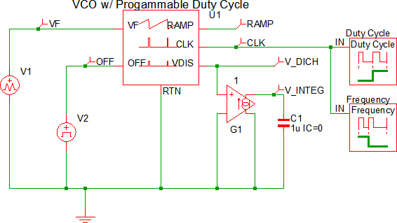 The test circuit used to generate the waveform examples in the next section can be downloaded here: simplis_070_vco_programmable_duty.