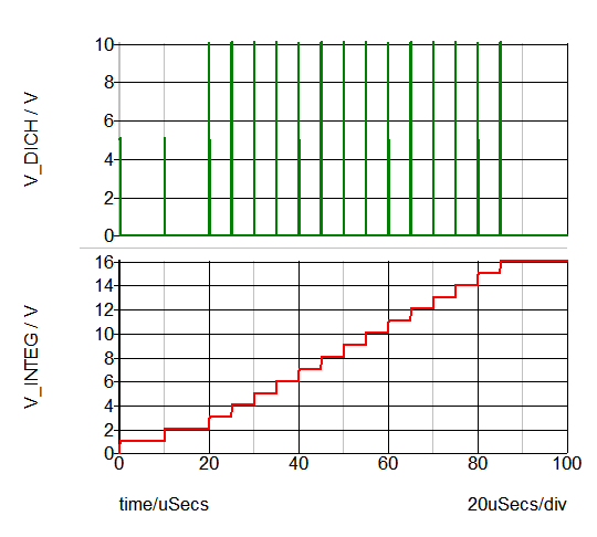 The waveform below shows the integrator output proportional to the number of clock cycles. The V_INTEG voltage increases 1V for every oscillator cycle.