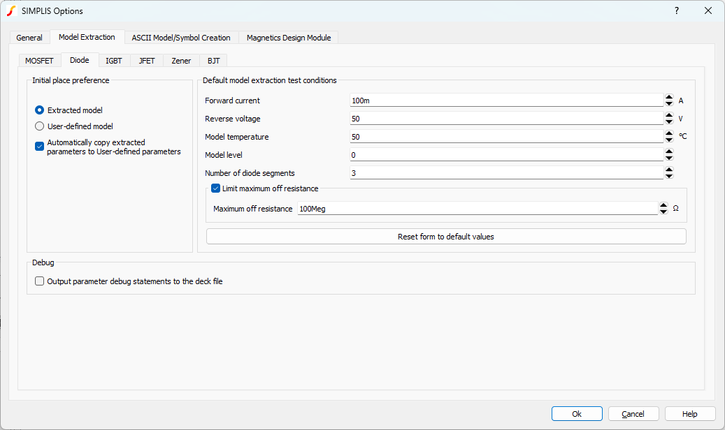 | Limit maximum off resistance | Checked | none | Limits the off resistance for the diode. For some SPICE models, this will produce a SIMPLIS model which runs faster. |