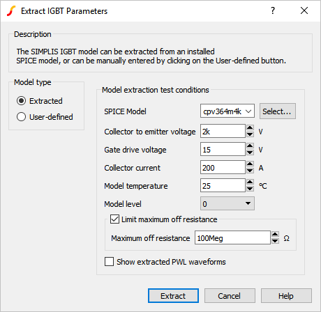 SIMPLIS extracts a model based on the model level chosen in the Extract IGBT Parameters dialog.
