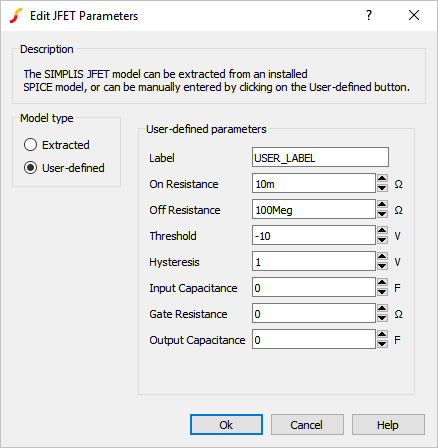 | Limit maximum off resistance | Checked | none | Limits the off resistance for the JFET. For some SPICE models, this will produce a SIMPLIS model which runs faster. |