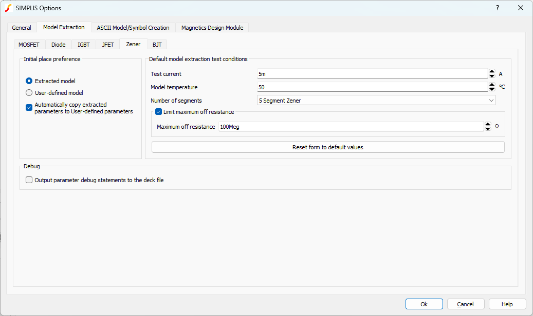 The default test conditions for the Extract Zener Parameters dialog can be set from the menu File > Options > SIMPLIS Options...