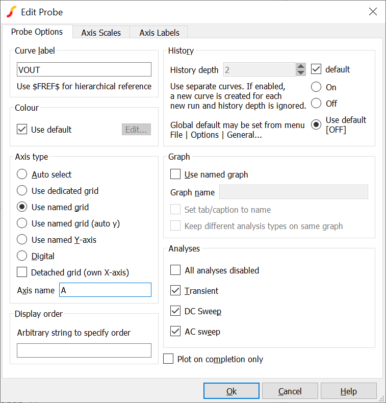 | Graph | Check Use Separate Graph to create a new graph sheet for the probe. You may also supply a graph name, in which case other probes using the same name will be directed to the same graph. The graph name may also be used to force curves to the same graph when the default action would be to create a new graph. This will happen for example for a new analysis type. The results from a Transient analysis, would usually be placed on a different graph sheet to the results from an AC analysis. Specifying this option with a name will override this. Check the Set tab/caption to name box to show the graph name in the caption bar and tab of the associated graph sheet. | ||||||||||
