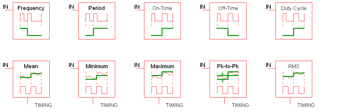 | Measurement | Frequency, Period, On-Time, Off-Time, Duty Cycle, Mean Maximum, Minimum, Peak-to-Peak, or RMS | ||||||||||