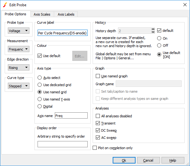 All probe types have a large number of options allowing you to customise how you want the graph plotted. For many applications the default settings are satisfactory. In this section, the full details of available probe options are described. Select the probe and press F7 or menu Edit Part...