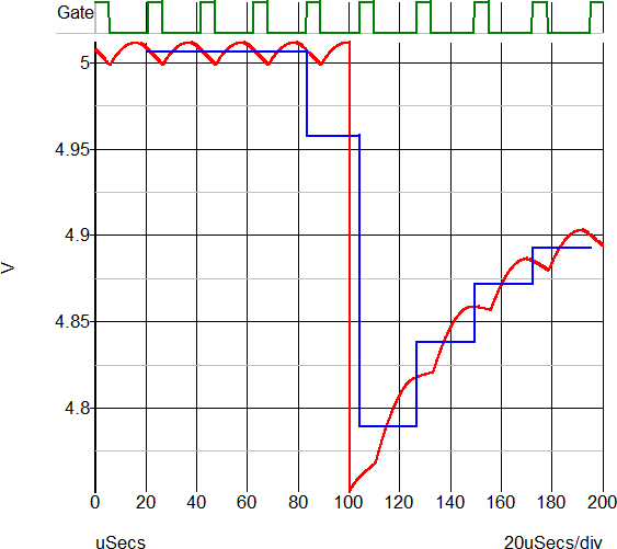 The per-cycle measurement can also be applied to amplitude of an input voltage or current. For example, you can plot the mean value of a switching power converter output with the mean value being calculated on a per-cycle basis. This example is show below - the mean value of a converter output voltage is plotted in a per-cycle manner. The gate voltage is used to determine the timing edge information.