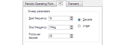 Points per decade/Number of points If a decade sweep is selected enter the number of points required for each decade. If a linear sweep is selected enter the total number of points for the analysis.