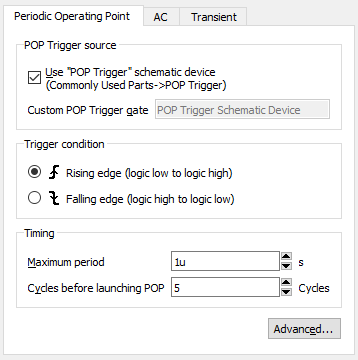 | Triggering - Use "POP Trigger" Schematic Device | POP analysis requires a trigger signal to indicate the start of each periodic cycle. The best way to define this is using a special schematic part. To place this select menu . You should check this box if you are using this part. |