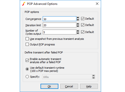 | Enable automatic transient analysis after a failed POP | If POP fails, a transient analysis automatically follows. This is to help diagnose the cause of POP failure but is also useful in some cases where a subsequent transient may settle sufficiently to perform a study of load transient behaviour. For further details, refer to the SIMPLIS Reference Manual. See SIMPLIS Reference Manual/Simplis-POP/tatements Relating to POP Analysis/.POP/Statement for POP Analysis/Behaviour of POP Analysis after POP Convergence Failure. |