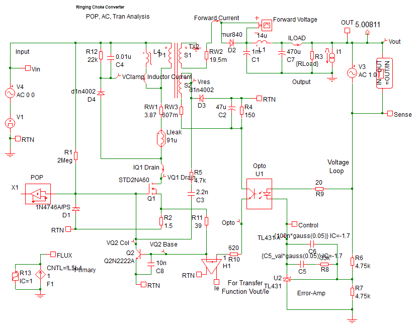 As a working example of SIMPLIS time domain simulations, the Self Oscillating converter from the What is SIMPLIS? topic is pictured below. This converter oscillates at a frequency dependent on the load current, which prevents the easy derivation of a small signal averaged model. Using the SIMPLIS POP analysis, the steady state behavior is quickly simulated, then the SIMPLIS AC analysis simulates the loop response on the same time domain model. The simulation results for this converter have been compared to hardware measurements. For information on how SIMPLIS simulations compare with real hardware measurements, see the Accuracy of PWL Models topic.