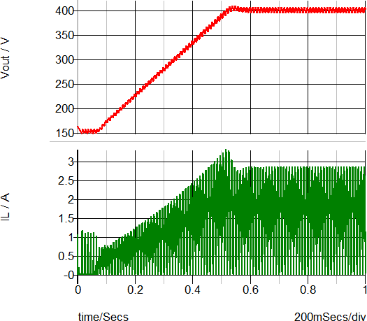 After setting the initial conditions, the converter is simulated using the SIMPLIS transient analysis. This particular converter took 2 min., 28 seconds of elapsed time to reach the 1s simulation end time. The waveforms below show the output voltage tracks the soft-start ramp in a controlled manner, there is a small overshoot, then the converter settles into steady state with an output voltage of 400V. Most of the elapsed time is wasted in bringing the slow control loop to the final, steady-state values.