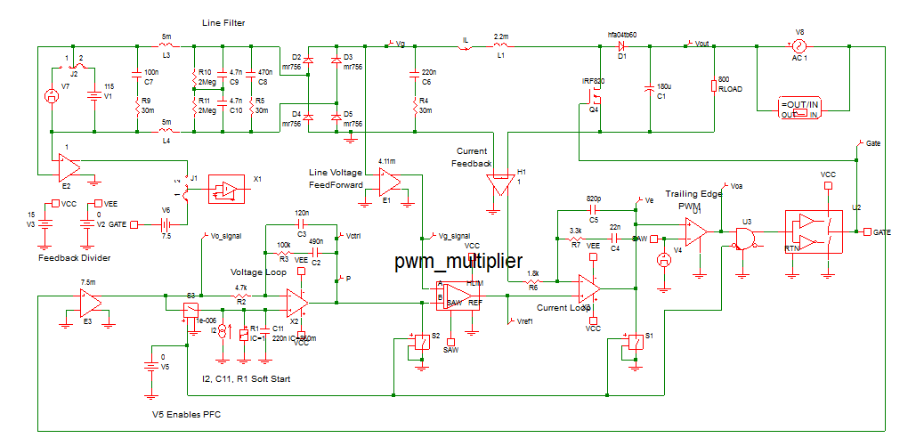A Power Factor Corrector (PFC) converter dramatically shows the amount of time POP can save when simulating a converter to steady-state. Because this converter has a slow control loop response time, the transient simulation must be run for a long time to allow the converter to settle into steady-state. The POP analysis can reduce the time required to reach steady-state by orders of magnitude.