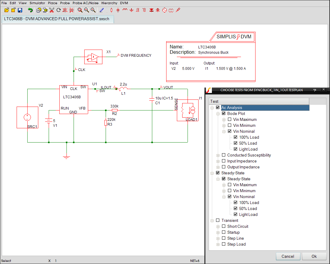 Finally, by right clicking on the DVM control symbol and choosing Edit Additional Parameters > Configure Sources and Loads, a user can enable Full PowerAssist by selecting the DVM sources and loads on the schematic that should be managed by DVM. The user can then enter in the design specifications and customize analysis parameters for the circuit. Once the design information has been entered, users can very simply instruct DVM to perform the following types of analyses: